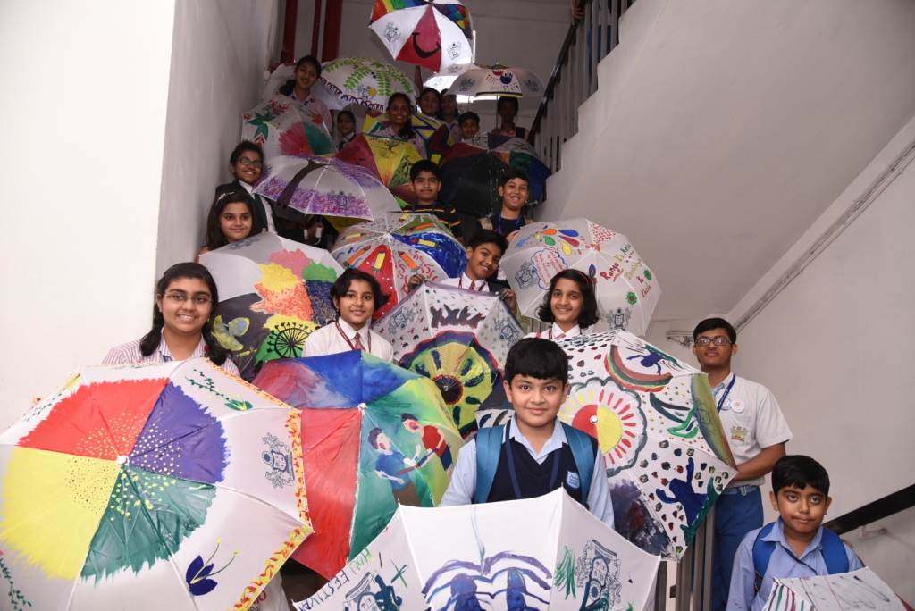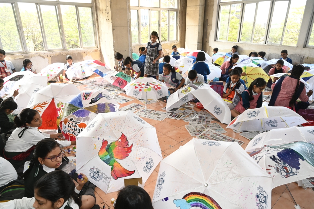 The children on the lawns, under the blue sky, displayed their imaginative and creative skills by conceptualizing the theme in graphic form and riot of colours achieved through mixing of paints on the umbrellas provided to them by Apeejay Anand Children’s Library using the quaint world of their imagination, resplendent in yellow, green, red and blue, depicting diverse designs.