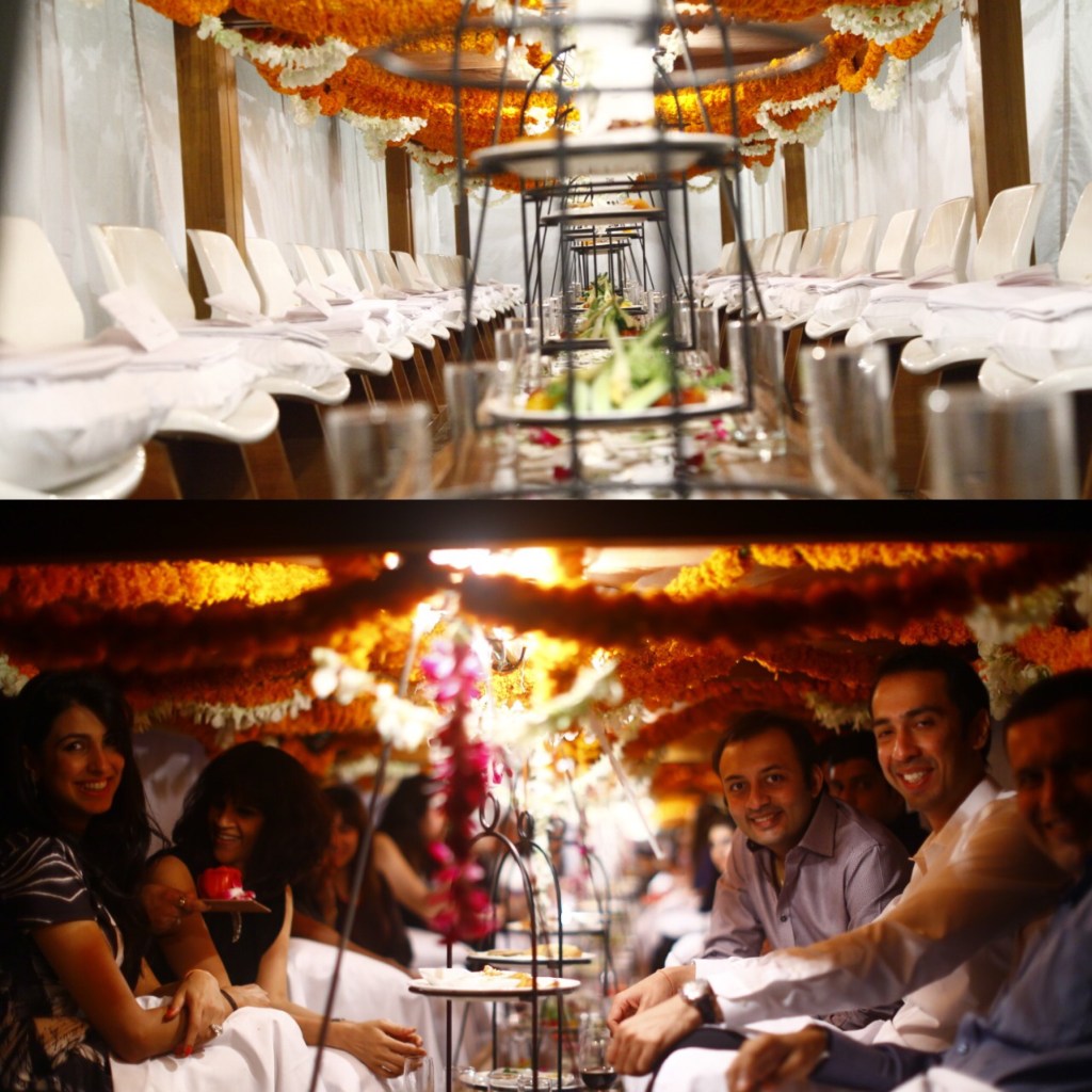This dining experience was curated and inspired our childhood or to relive a reminiscent fairtytale of our childhood ‘Alice in Wonderland’. The eating concept revolved around plethora of surprise elements that were woven into the experience. The dinner was served in a specially customised Table setup in which guests would dine seated underneath the large tables. There was food hanging under the tables as diners discovered the space. Desserts would magically appear above the tables as guest finish main course and come out from beneath the tables. Working closely with Ms. Paul for each tiny detail was an amazing learning experience.
