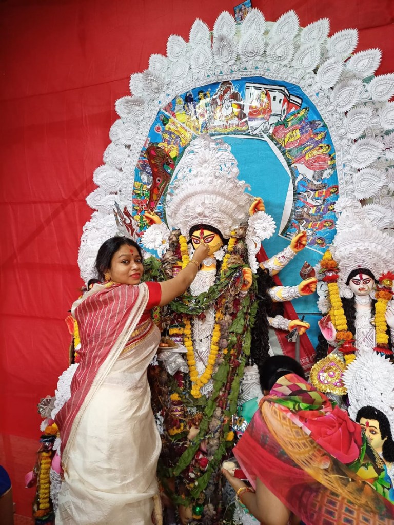 “In a normal year, Durga Puja begins a week after Mahalaya, but this year 2020 was anything but normal. Durga Puja during this Corona time shaped up as “Puja koro na”. However, for me personally, my apartment’s puja though closed for all outsiders was open to residents only. Keeping in mind all applicable norms, our Puja was conducted. It ended with Mayer Boron and Sindoor khela. So for me the essence of Puja of worshipping the arrival of the Goddess remained though the festivity attached to it was muted,” says Moon Moon Seal, General Manager – Finance, Apeejay Surrendra Management Services Private Limited sharing an image of herself and the Goddess.